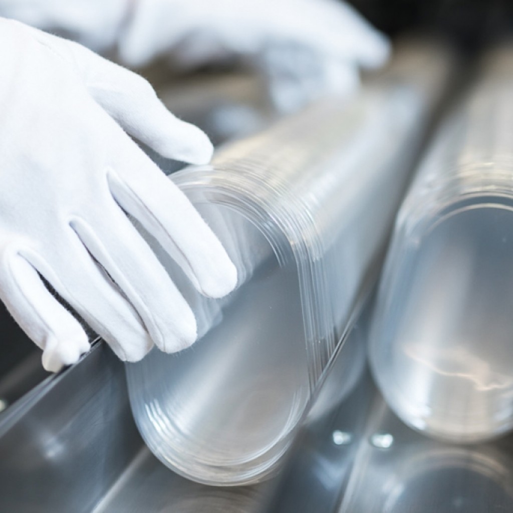 Wir verarbeiten alle gängigen Thermoplaste, zum Beispiel APET, CPET, PP, PE, PS, OPS, PLA sowie deren Verbunde.